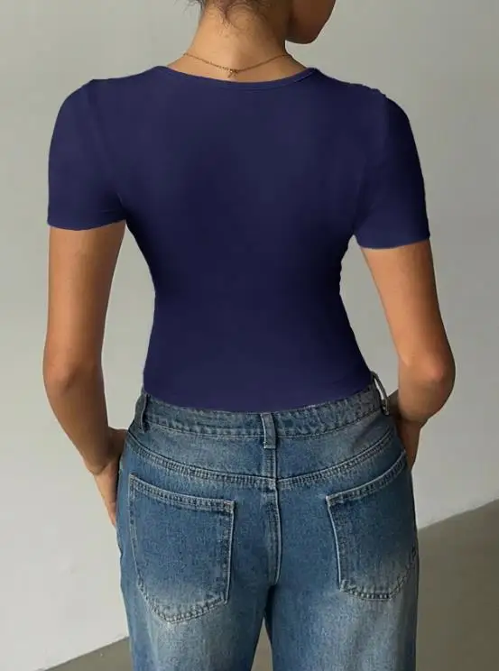 Top Women 2025 Spring Summer New Solid Color Versatile Slim Fit Short Sleeved Sexy Deep V-Neck Casual Daily Crop T-Shirt
