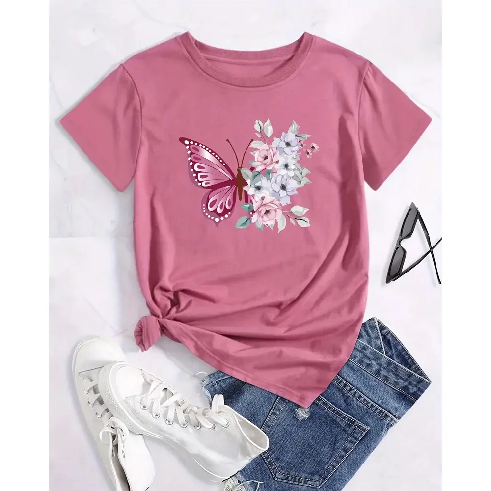 Women’s T-shirt Summer Round Neck Short Sleeved Loose Top Butterfly Flower Pattern Elegant Clothing Women’s Party T-shirt